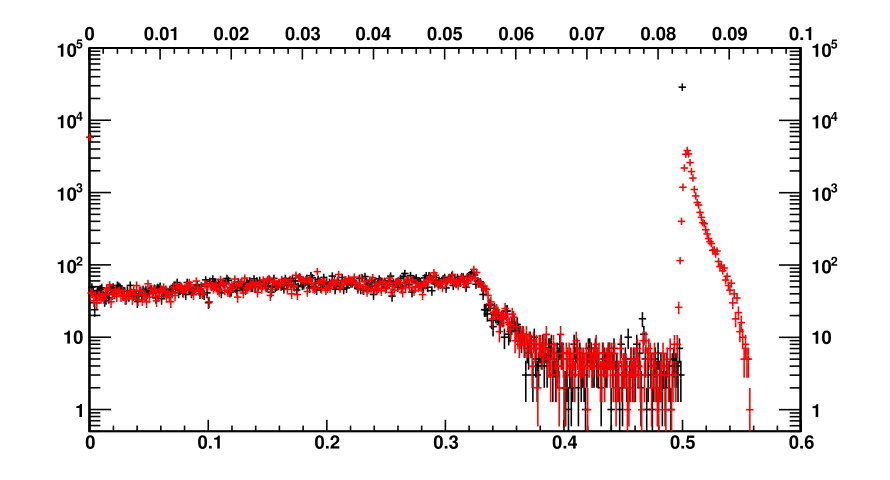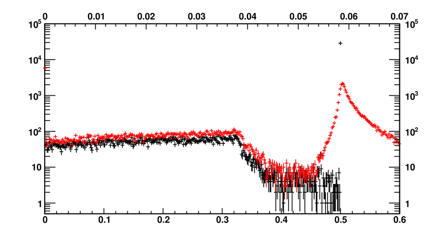 This seems to work reasonably well, except for a heavy high energy tail observed in the photopeak of the optical photon energy deposited in the tracking volume. For demonstration, I’ve run the simulation firing 500keV gammas into detector along it’s central axis. The histogram below tallies the energy deposited into the scintillation crystal by all processes excluding optical photons (black marks, using the bottom X axis) and the energy deposited in the tracking volume by only optical photons (red marks, using the top X axis).