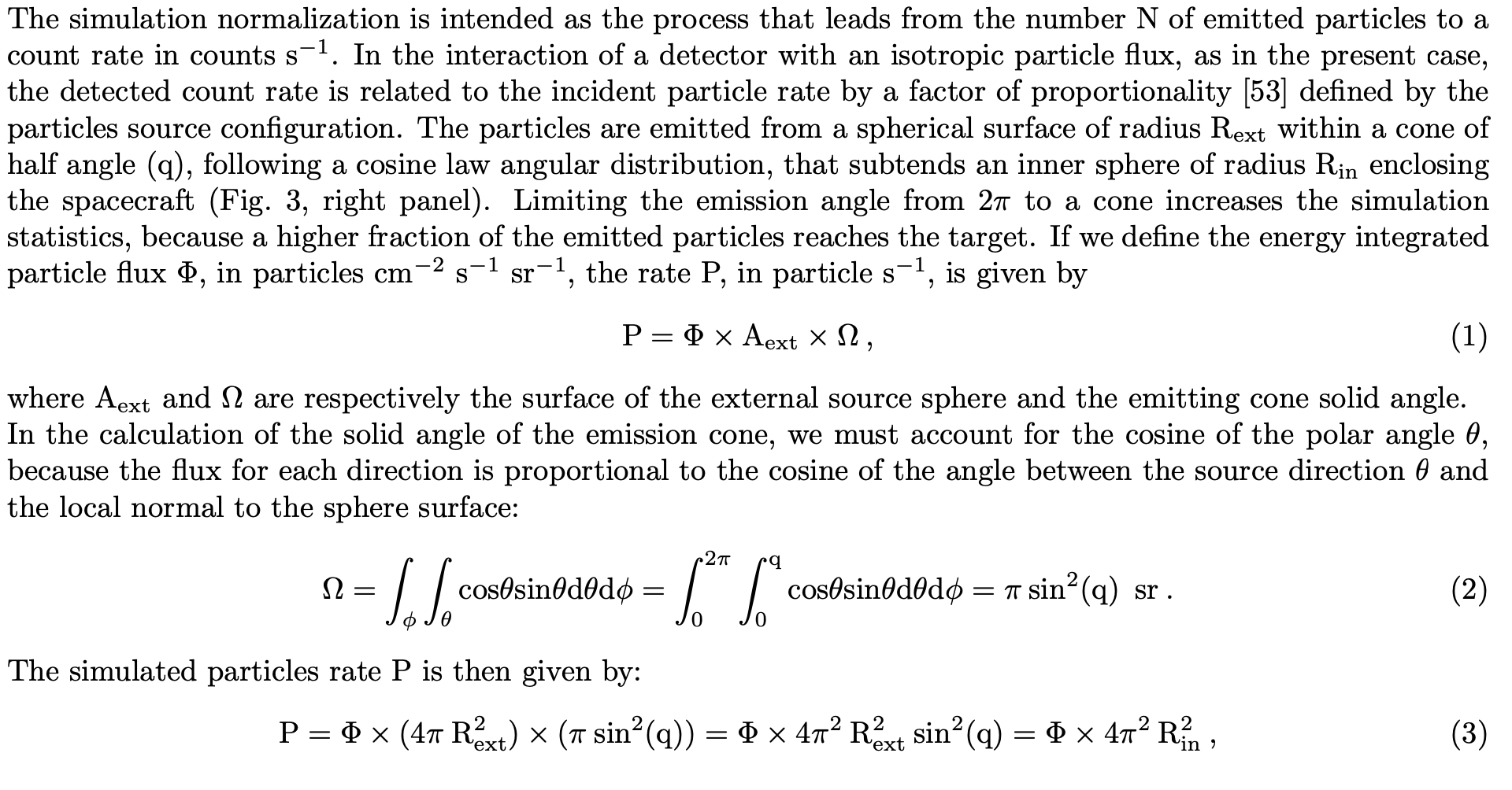 I’m not sure I understand why this whole process needs 2 spheres in the first place. We put our counts in on a single spherical surface, and the correction factor (cosine of the polar angle theta) is only needed when we are counting the flux crossing a surface and planning to use that for a “second-stage” simulation where we then put it into an instrument model. If you are going straight from the external radiation field into an instrument I don’t think that factor is ever needed.