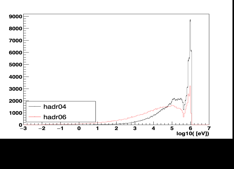 I basically compared the above plot with the Hadr04 example that I am working with. The spectrum looks fairly close, though the second low energy peak is quite shifted between the two examples. Do you have an idea of what is causing this behavior?